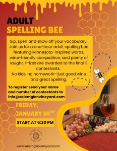 Sip, spell, and show off your vocabulary! Join us for a one-hour adult spelling bee featuring Minnesota-inspired words, wine-friendly competition, and plenty of laughs. Prizes are awarded to the final 3 contestants.
