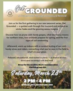 Join us for the first gathering in our new seasonal series, Get Grounded — a guided walk through the vineyard and orchard as winter fades and the growing season begins.
