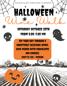 Creep, prowl, slink, lurk, sneak your way though the spooky evening vineyard on Salem Glen’s 4th Annual Hallo-Wine Walk.