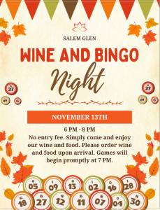Join us for a fun evening of bingo! There is no fee, simply come enjoy our wine and food while you play! Reservations are required click here. Please order food and wine upon arrival. Games will begin promptly at 7 pm